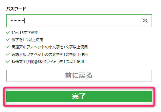 パスワードの条件は前と同じで、10~15文字で「数字」「アルファベット(大)」「アルファベット(小)」「記号」をそれぞれ必ず1文字は入れる必要があります。
