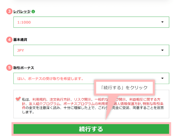 口座開設ボーナス、入金ボーナスはもらっておいて損はないので「受け取りを希望します」を選択しましょう。