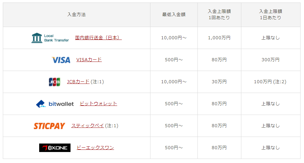 1万円以上からになりますがおすすめは銀行送金。国内FX業者に入金する時と同じ感覚で自分の国内銀行口座から入金できます。